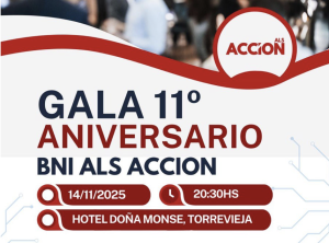 Este miércoles 14 de noviembre, el grupo BNI ALS Acción celebra su Gala del 11º Aniversario en el emblemático Hotel Doña Montse de Torrevieja. Será una velada muy especial en la que nos reuniremos todos los miembros del grupo junto con nuestros invitados para conmemorar once años de éxitos, colaboración y crecimiento empresarial compartido.